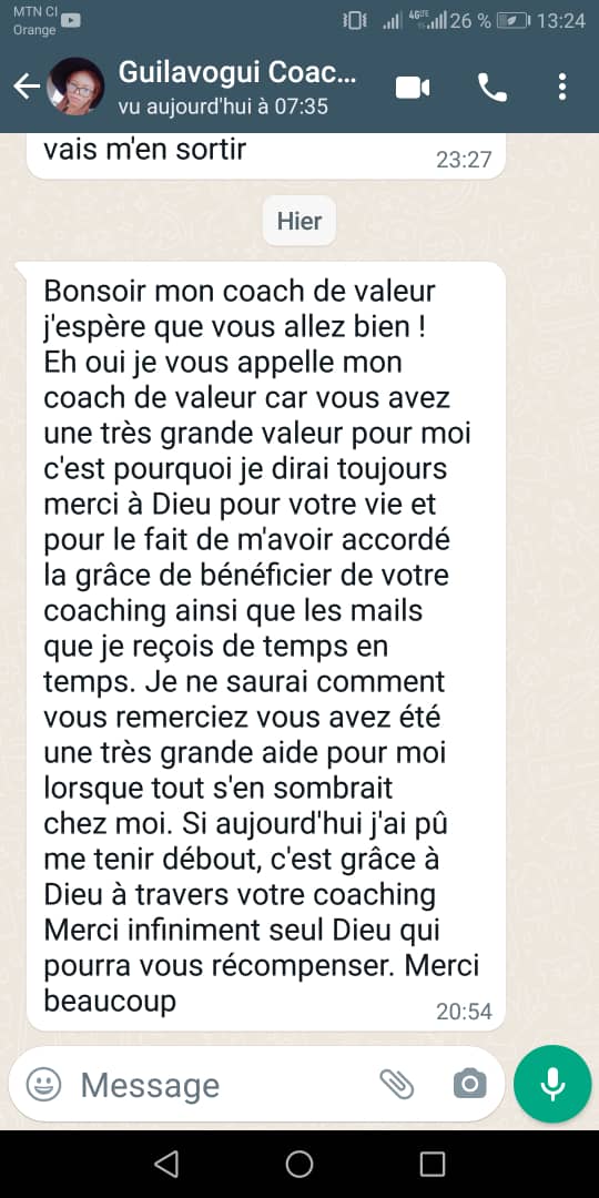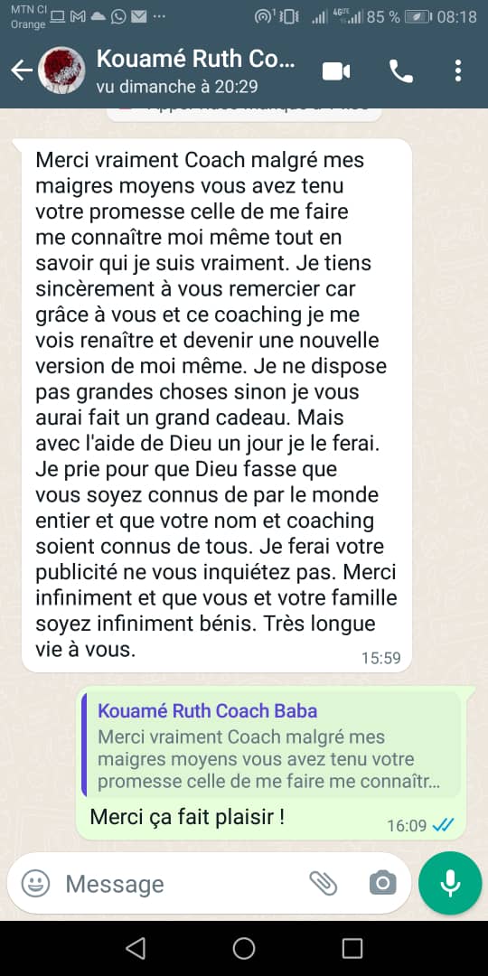 Coach de transformation car je travaille en profondeur sur l’être humain afin qu’il puisse se découvrir, se connaître pour atteindre le véritable succès.