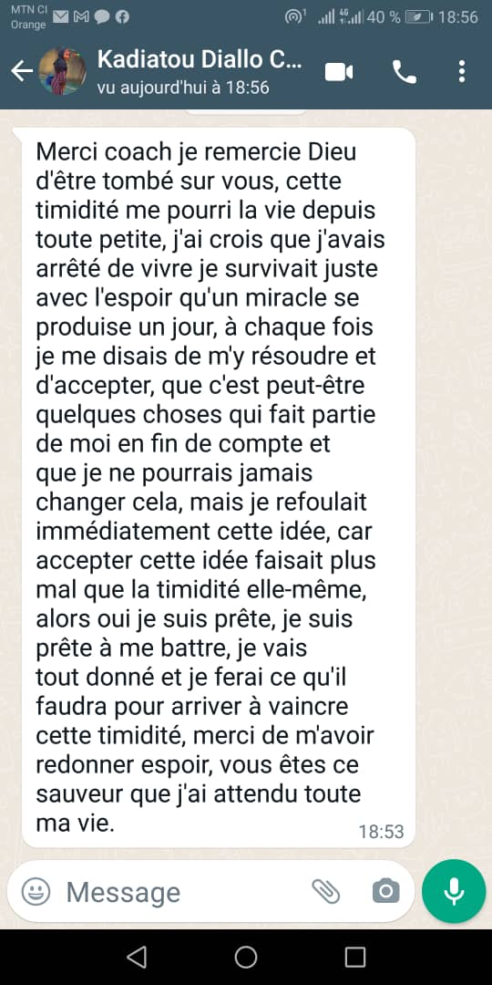 Depuis que j'ai fais la connaissance de Coach Baba j'ai enfin réussi à dépasser mes freins, à me découvrir et à maîtriser le pouvoir, la puissance et la possibilité qui somnollais en moi."